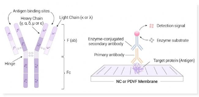 圖 1. 抗體結(jié)構(gòu) (左) 和檢測(cè)原理 (右) 示意圖