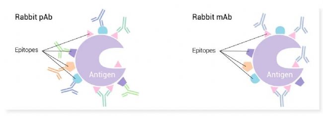 小 M 為大家鋪墊了抗體的基礎(chǔ)知識(shí)及原理,接下來作為萌新的你可能就要問了,“抗體好像有兩個(gè)?”其實(shí)我們常說的抗體指的是第一抗體,即能和抗原特異性結(jié)合的蛋白,種類包括單克隆抗體 (monoclonal antibody,mAb) 和多克隆抗體 (polyclonal antibody, pAb)。前者可識(shí)別抗原上的單個(gè)表位,而后者能夠特異性結(jié)合同一目標(biāo)抗原上的不同結(jié)合位點(diǎn) (圖 2)。