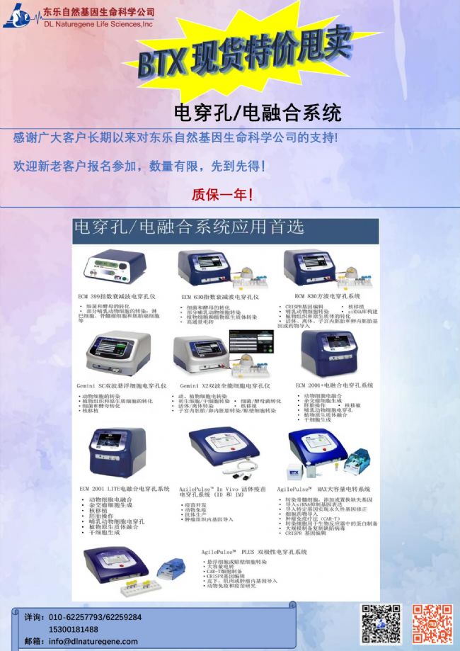為了感謝廣大客戶長期以來對(duì)東樂自然基因生命科學(xué)公司的支持,現(xiàn)推出BTX電穿孔/電融合系統(tǒng)現(xiàn)貨特價(jià)甩賣活動(dòng),歡迎新老客戶報(bào)名參加。