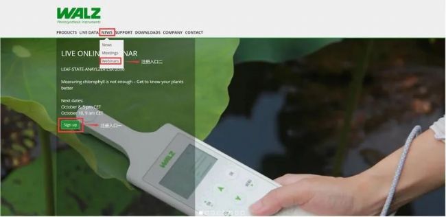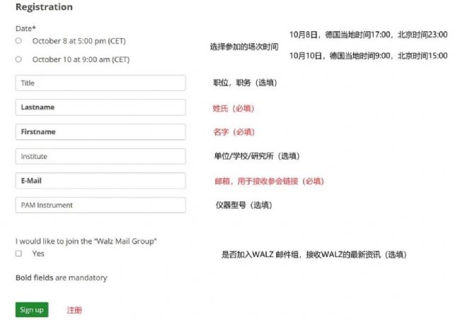 打開德國WALZ公司官網(wǎng)(www.walz.com)即可看到注冊(cè)入口,點(diǎn)擊Sign up,可直達(dá)注冊(cè)頁面,選擇參與的場(chǎng)次時(shí)間,填寫信息,點(diǎn)擊Sign up注冊(cè),之后不久就會(huì)收到回執(zhí)郵件。郵件包含參會(huì)鏈接,開會(huì)當(dāng)天,點(diǎn)擊Online seminar login即可參會(huì)。