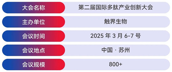 由觸界生物主辦的第二屆國際多肽產(chǎn)業(yè)創(chuàng)新大會(Peptides 2025)將于2025年3月6-7號在蘇州舉辦,旨在搭建行業(yè)學(xué)術(shù)交流、產(chǎn)業(yè)合作的多肽產(chǎn)業(yè)圈,為多肽行業(yè)尋求更優(yōu)的發(fā)展路徑助力。