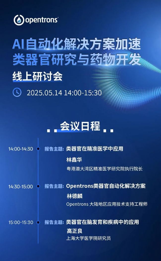 類器官技術(shù)正在重塑精準(zhǔn)醫(yī)學(xué)的未來!為促進(jìn)行業(yè)交流與技術(shù)轉(zhuǎn)化,Opentrons 聯(lián)合 ISCO(干細(xì)胞與類器官創(chuàng)新計劃組織),特邀領(lǐng)域頂尖專家,于2025年5月14日14:00-15:30(北京時間)舉辦線上研討會。誠邀您共探類器官技術(shù)的創(chuàng)新應(yīng)用與自動化解決方案!