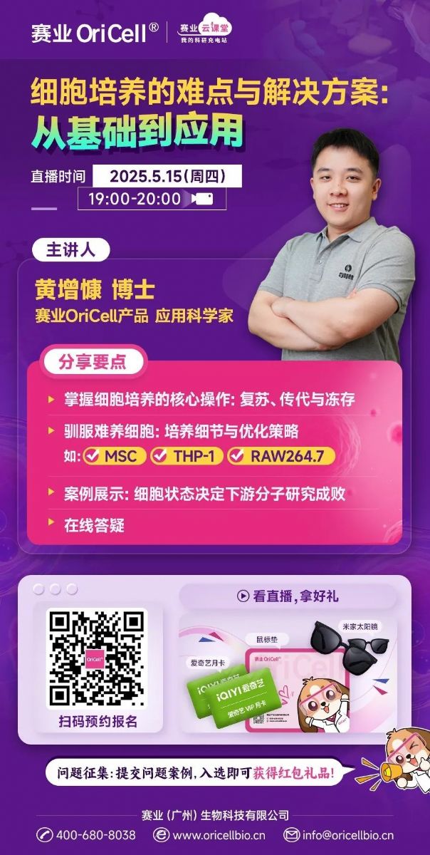 5月15日(周四)晚7點(diǎn),賽業(yè)OriCell產(chǎn)品 應(yīng)用科學(xué)家黃增慷博士將帶你一起攻克細(xì)胞培養(yǎng)難題!本期課程不僅有滿滿的干貨講解、超多實(shí)用案例分享,還可提交你在細(xì)胞培養(yǎng)各環(huán)節(jié)中遇到的實(shí)際困難,專家為你在線答疑!
