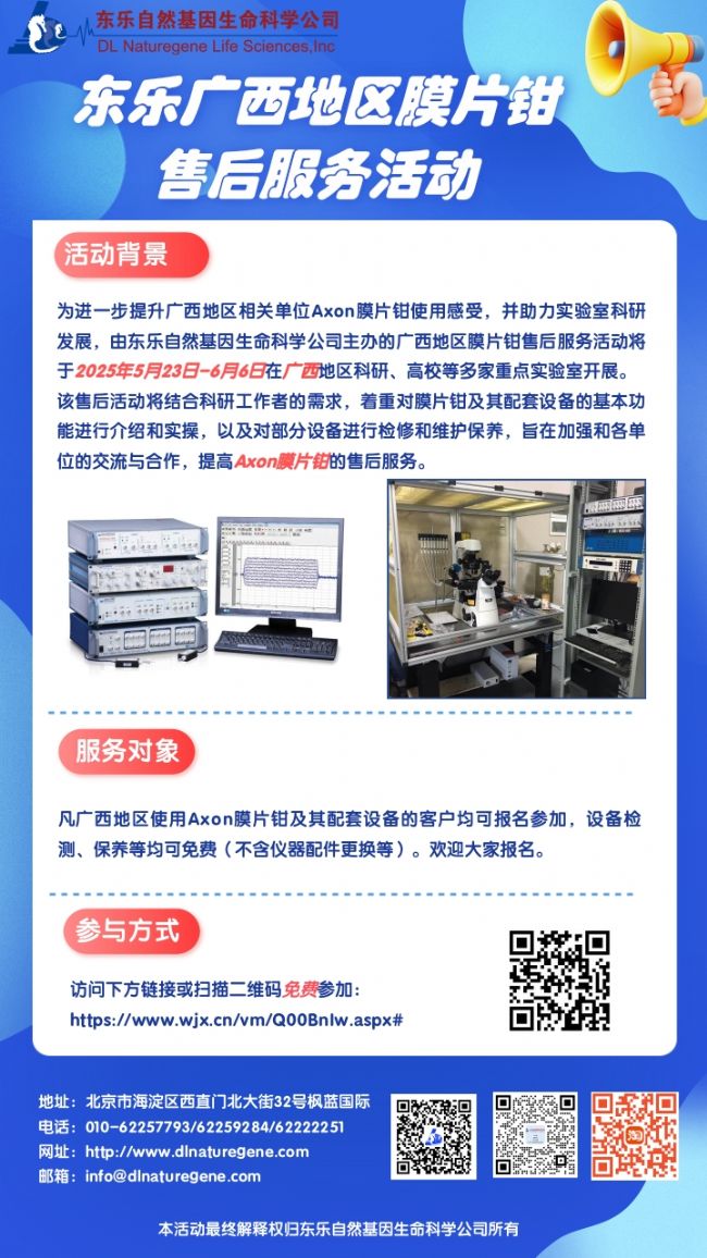 為進(jìn)一步提升廣西地區(qū)相關(guān)單位Axon膜片鉗使用感受,并助力驗(yàn)室科研發(fā)展,由東樂(lè)自然基因生命科學(xué)公司主辦的廣西地區(qū)售后服務(wù)活動(dòng)將于2025年5月23日-6月6日在廣西地區(qū)科研、高校等多家重點(diǎn)實(shí)驗(yàn)室開(kāi)展。