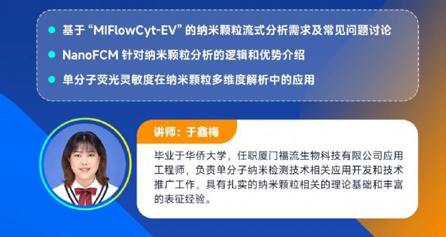 作為生物納米顆粒表征的行業(yè)領(lǐng)導(dǎo)者,NanoFCM致力于推動納米檢測技術(shù)的標(biāo)準(zhǔn)化與智能化。本期webinar將基于國際公認(rèn)的單EV流式細(xì)胞術(shù)分析圣經(jīng)–MIFlowCyt-EV(Minimum Information about a FC Experiment standard in an EV-FC-specific reporting framework, MIFlowCyt-EV),探討納米顆粒的流式分析需求,聚焦先進單分子流式技術(shù)在單個納米顆粒表征的應(yīng)用及檢測結(jié)果評估,惠及外泌體、脂質(zhì)納米顆粒及病毒等研究領(lǐng)域的基礎(chǔ)科研和產(chǎn)業(yè)化。