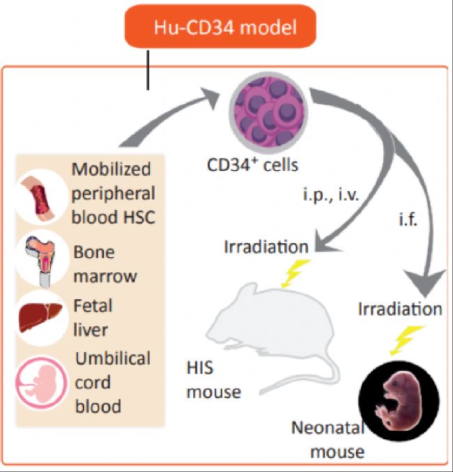 HSC(CD34+)模型是目前臨床前應用的一類重要的免疫系統(tǒng)人源化小鼠模型,通過將人CD34+造血干細胞(HSC)由腹腔或者尾靜脈注入免疫缺陷小鼠,可以實現(xiàn)了人類免疫系統(tǒng)的重建。
