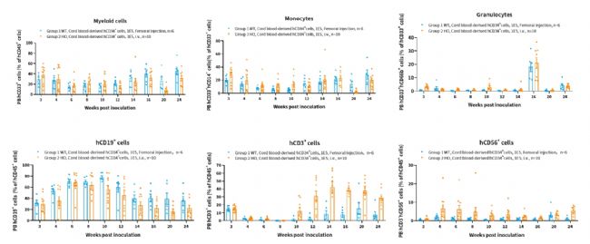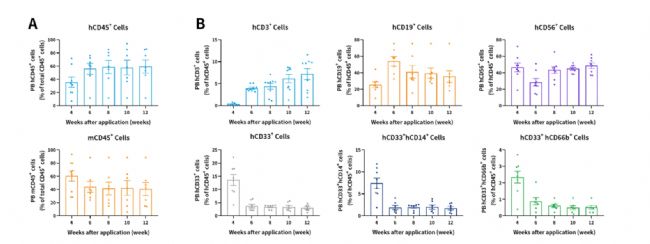 結(jié)果顯示,huHSC-hIL3-hCSF2-Tg(M-NSG)小鼠呈現(xiàn)出良好的免疫重建效果,髓系細胞與淋巴細胞的重建效果明顯增強。小鼠可長時間穩(wěn)定產(chǎn)生人源免疫細胞。