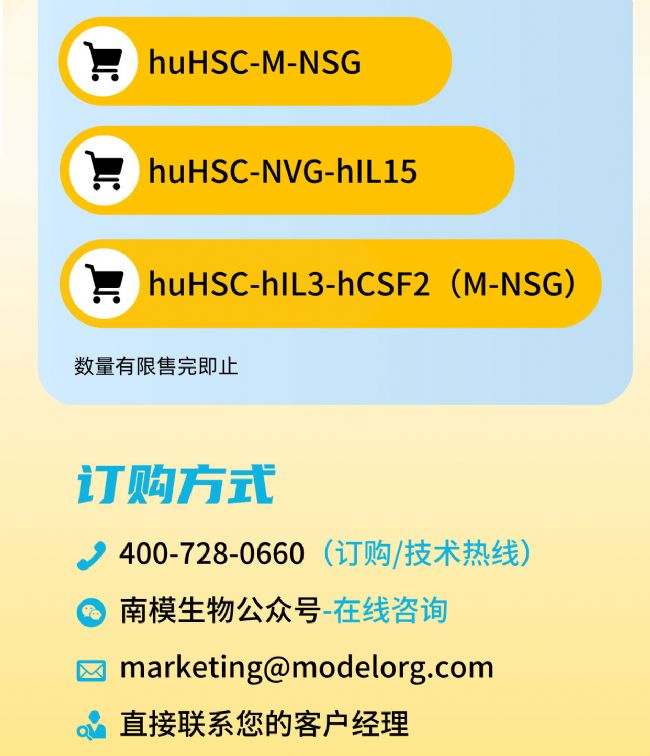 然而由于物種差異,在免疫重建過程中M-NSG小鼠的鼠源細胞因子無法有效支持人源NK、髓系等免疫細胞的發(fā)育,限制了其免疫重建的效果。為了突破重度免疫缺陷小鼠的免疫系統(tǒng)重建難關(guān),南模生物針對免疫調(diào)節(jié)因子基因進行人源化改造,在更多基因修飾的小鼠背景上開發(fā)出一系列升級版HSC (CD34+) 模型,能夠更好的模擬藥物進入人體后免疫系統(tǒng)的響應,對腫瘤免疫領(lǐng)域有重要的推進作用。