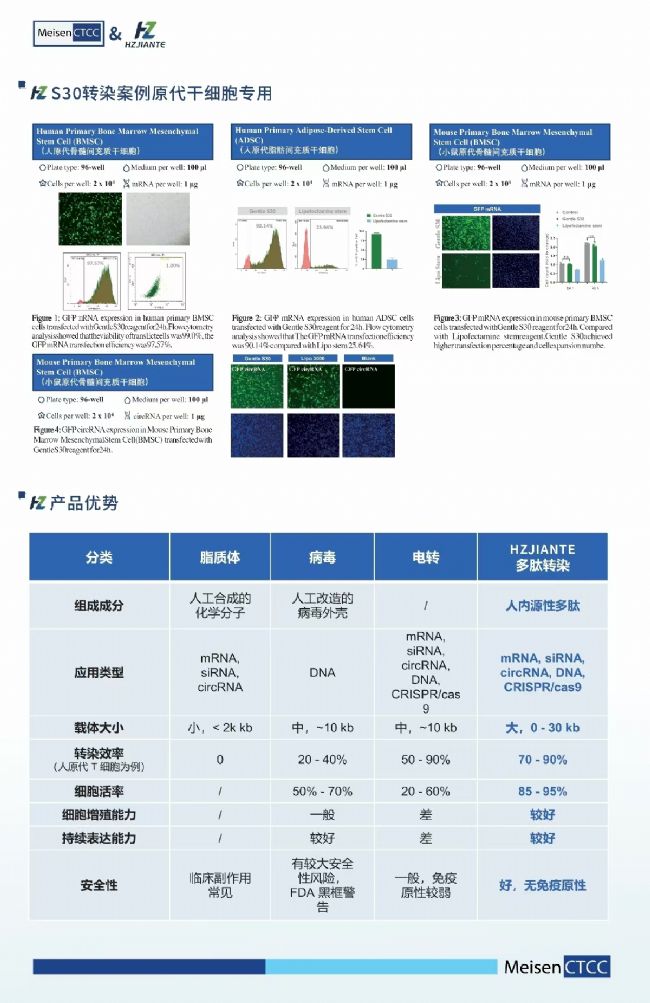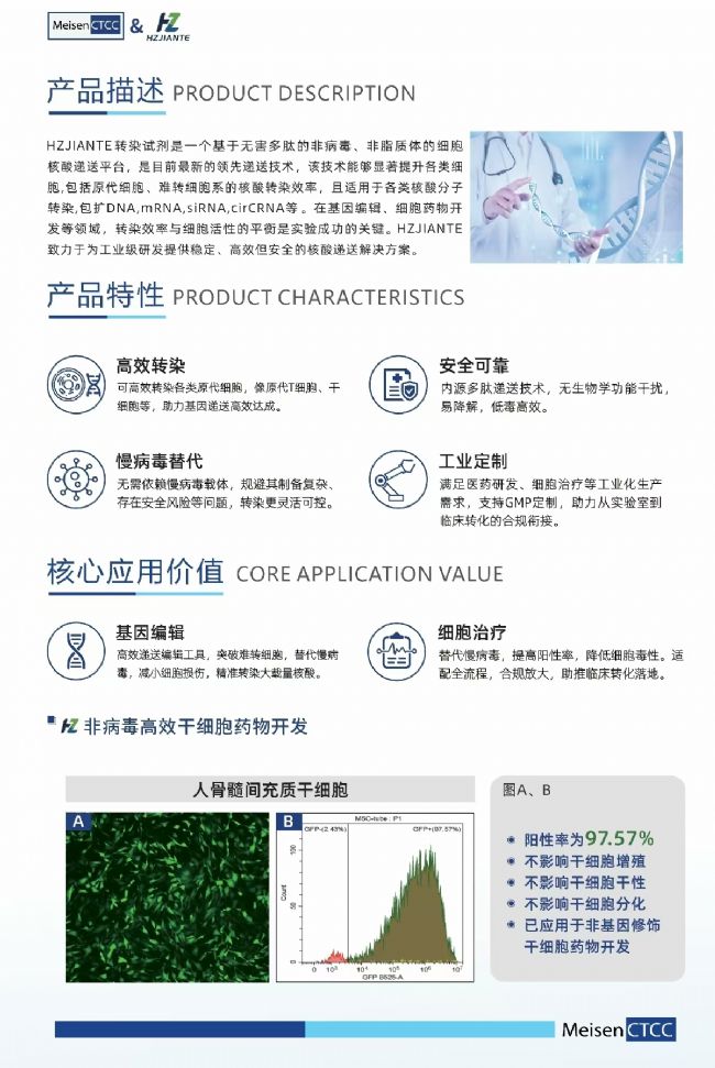 HZJIANTE 轉(zhuǎn)染試劑是一個(gè)基于無害多肽的非病毒、非脂質(zhì)體的細(xì)胞 核酸遞送平臺(tái),是目前最新的領(lǐng)先遞送技術(shù),該技術(shù)能夠顯著提升各類細(xì) 胞,包括原代細(xì)胞、難轉(zhuǎn)細(xì)胞系的核酸轉(zhuǎn)染效率,且適用于各類核酸分子 轉(zhuǎn)染,包擴(kuò)DNA,mRNA,siRNA,cirCRNA等。在基因編輯、細(xì)胞藥物開 發(fā)等領(lǐng)域,轉(zhuǎn)染效率與細(xì)胞活性的平衡是實(shí)驗(yàn)成功的關(guān)鍵。HZJIANTE 致力于為工業(yè)級(jí)研發(fā)提供穩(wěn)定、高效但安全的核酸遞送解決方案。