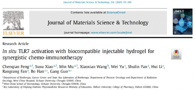 近期在《Journal of Materials Science & Technology》刊登了一項(xiàng)新研究。研究團(tuán)隊(duì)開發(fā)一種基于天然材料的生物相容性可注射水凝膠(CPE),以多酚-硼酸酯鍵為交聯(lián)基礎(chǔ),實(shí)現(xiàn)化療藥物卡巴他賽(Cab)與 TLR7 激動(dòng)劑 R837 的局部共遞送,構(gòu)建了 “化療誘導(dǎo) ICD + 免疫佐劑激活免疫” 的協(xié)同治療體系。Cab 誘導(dǎo)腫瘤細(xì)胞 ICD,釋放 CRT、HMGB1 等損傷相關(guān)分子模式(DAMPs)及 TAAs,促進(jìn)樹突狀細(xì)胞(DC)成熟;R837 原位釋放激活 TLR7 介導(dǎo)的信號(hào)通路,進(jìn)一步增強(qiáng)免疫應(yīng)答,二者協(xié)同提升抗腫瘤效果。