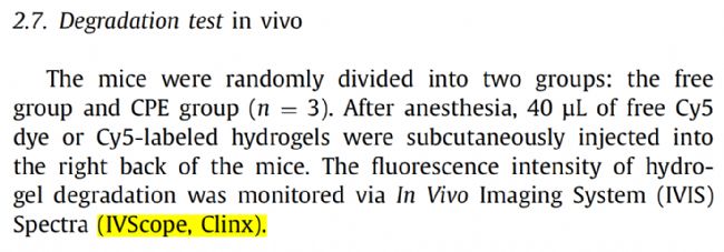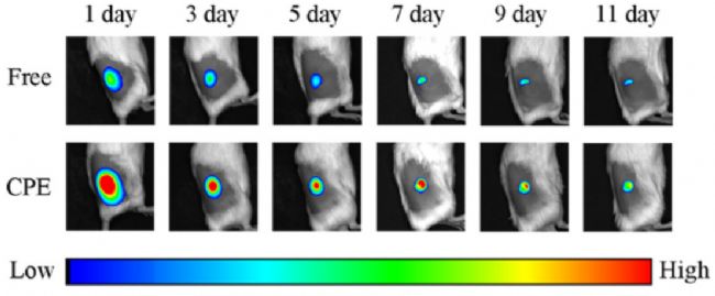 為了評(píng)估水凝膠在體內(nèi)的降解情況及藥物滯留能力,研究團(tuán)隊(duì)通過小動(dòng)物活體成像系統(tǒng)(IVScope,Clinx)監(jiān)測(cè)水凝膠降解過程中的熒光強(qiáng)度變化,研究人員將6-8周齡雌性BALB/c小鼠(體重17-19g)隨機(jī)分為兩組,即游離組(注射游離 Cy5 染料)和 CPE 組(注射 Cy5 標(biāo)記的 CPE 水凝膠),每組 3 只。待小鼠麻醉后,在其右背部皮下分別注射 40μL 游離 Cy5 染料或 Cy5 標(biāo)記的 CPE 水凝膠。