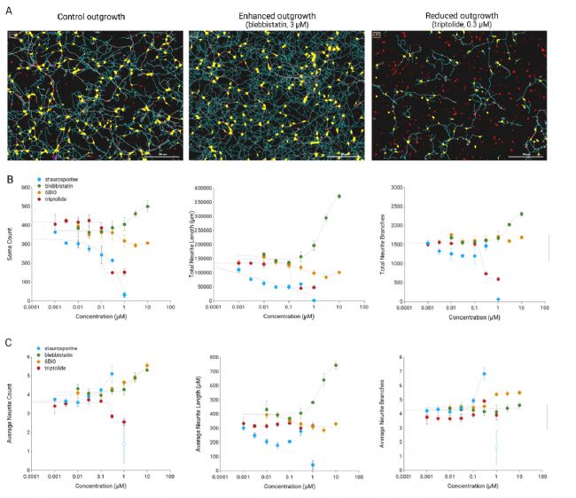 該案例展示了最大化減少人為干預的情況下,搭建高通量自動化流程對于建立和優(yōu)化 96 孔板高通量多能干細胞(iPSC)衍生的神經(jīng)元和原代培養(yǎng)的神經(jīng)元細胞分析模型的優(yōu)勢,并通過常用的激動劑和抑制劑驗證了該平臺的靈敏性和性能優(yōu)勢。這樣的自動化神經(jīng)分析平臺可以用于神經(jīng)科學研究的諸多研究領域,幫助研究者快速獲得神經(jīng)細胞的生長動態(tài)情況監(jiān)測、神經(jīng)突長度、面積、神經(jīng)突分支數(shù)等多評估參數(shù)的同步獲取。