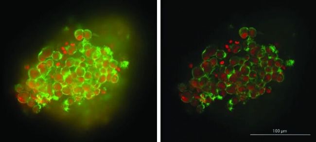 上圖為使用標(biāo)準(zhǔn) 60 µm 轉(zhuǎn)盤(左)和 60 µm DSD(右)采集的細(xì)胞球體 Z 軸切片圖像。深層切片轉(zhuǎn)盤讓有厚度的生物樣本內(nèi)部細(xì)節(jié)清晰可見(jiàn),適用于深層組織穿透的共聚焦轉(zhuǎn)盤(DSD)減少了厚組織樣本內(nèi)的信號(hào)干擾,從而可以清晰地觀察厚組織樣本和細(xì)胞球體。從具有挑戰(zhàn)的(厚)樣本類型中獲得更詳細(xì)的數(shù)據(jù)。