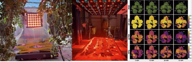 系統(tǒng)集成PAM技術(shù)與FIF閃光誘導(dǎo)技術(shù)、RGB成像、高分辨率高靈敏度Thermo-RGB成像等表型成像技術(shù),可顯示光能在植物光合系統(tǒng)中的流動(dòng)過(guò)程,揭示植物光合效率、生理狀態(tài)及脅迫狀況,同時(shí)可進(jìn)行株高、冠幅等形態(tài)測(cè)量,具備頂部與側(cè)面成像功能,實(shí)現(xiàn)植物原位表型分析;左、中圖:移動(dòng)植物表型平臺(tái)側(cè)面、頂部成像;右圖:煙草植物病原真菌分泌蛋白質(zhì)表達(dá)
