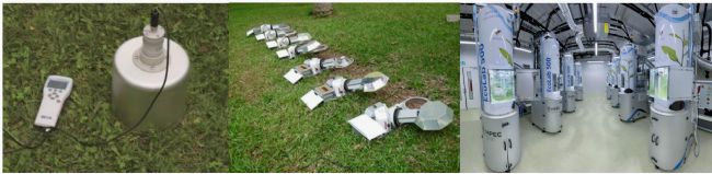 從左至右依次為:Soilbox-343便攜式土壤呼吸測(cè)量系統(tǒng);多通道土壤呼吸觀測(cè)系統(tǒng);Ecotron植物-生態(tài)系統(tǒng)實(shí)驗(yàn)平臺(tái):可在受控條件下對(duì)土壤-植物-大氣連續(xù)體中的生態(tài)系統(tǒng)功能進(jìn)行綜合研究