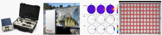從左至右依次是:FMS便攜式多功能能量代謝測(cè)量?jī)x;魚(yú)類呼吸代謝測(cè)量系統(tǒng)中圖:VISIR動(dòng)物行為觀測(cè)分析結(jié)果圖;斑馬魚(yú)高通量行為觀測(cè)系統(tǒng)