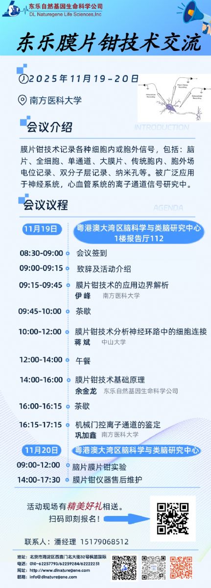 由東樂自然基因生命科學(xué)公司主辦的廣東省膜片鉗技術(shù)交流活動將于2025年11月19-20日在廣州舉行,誠摯的邀請您前來探討交流膜片鉗技術(shù)與應(yīng)用。