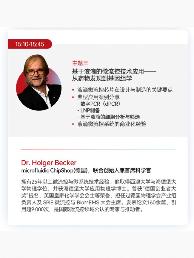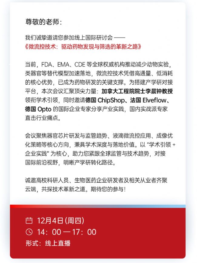 技術(shù)趨勢與監(jiān)管導(dǎo)向同頻共振,亟需搭建連接國際前沿與國內(nèi)實踐的產(chǎn)學(xué)研對接平臺。12月4日,《微流控技術(shù):驅(qū)動藥物發(fā)現(xiàn)與篩選的革新之路》線上國際研討會即將啟幕,我們以“賦能行業(yè)創(chuàng)新、促進資源聯(lián)動”為核心初衷,特邀院士領(lǐng)銜的頂尖學(xué)術(shù)力量與全球標桿企業(yè)團隊,為國內(nèi)高校、科研院所及生物醫(yī)藥從業(yè)者帶來“技術(shù)+實踐+趨勢”的三重賦能。
