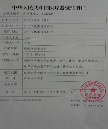 興化市分析儀器廠創(chuàng)建于1985年,是國內(nèi)生產(chǎn)生化儀器的專業(yè)性工廠,具有三十多年的研制開發(fā)經(jīng)驗,產(chǎn)品廣泛應(yīng)用于全國各大專院校,科研單位。2018年8月27日獲FYY-3型核酸分子雜交儀醫(yī)療器械注冊證:蘇械注準:20182221288 ;2018年9月7日獲醫(yī)療器械生產(chǎn)許可證:蘇食藥監(jiān)械生產(chǎn)許20180116號。