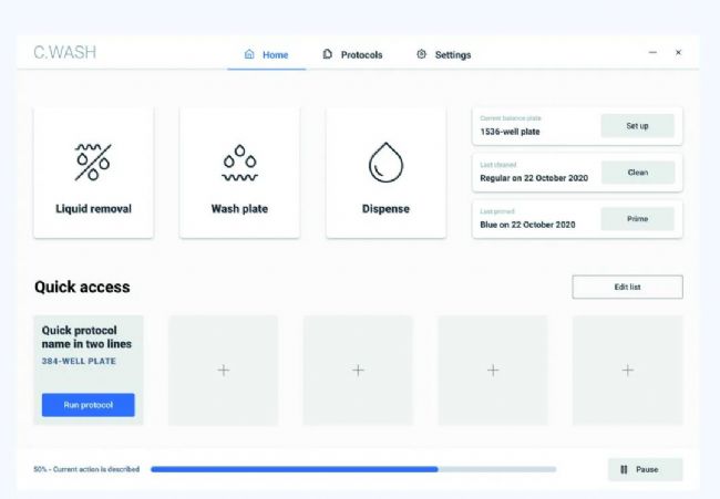 并且C.WASH軟件界面設(shè)計直觀,簡潔易用,用戶可以在系統(tǒng)自帶的程序中選擇不同的洗板模式來實現(xiàn)液體殘留的簡單控制,其自動化功能可顯著提升實驗效率。SiLA2接口的完善通信支持與API集成,而且與第三方控制軟件相兼容。