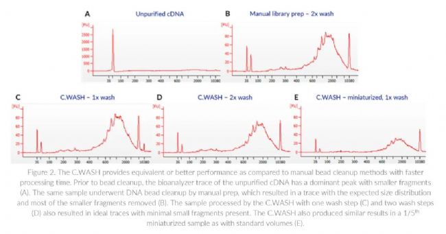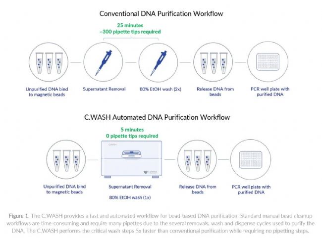 而C.WASH在關(guān)鍵洗滌步驟比傳統(tǒng)純化快5倍,同時不需要移液步驟,為基于磁珠的DNA純化提供了一個快速和自動化的工作流程,不僅可以簡化NGS庫準備工作流程,還能確保結(jié)果一致。