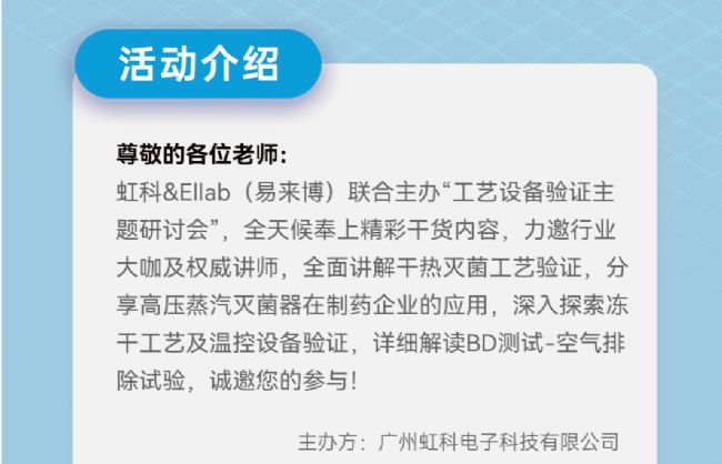 虹科&Ellab(易來博)聯(lián)合主辦“《工藝設(shè)備驗(yàn)證》線上主題研討會(huì),全天候奉上精彩干貨內(nèi)容,力邀行業(yè)大咖及權(quán)威講師,分享需要驗(yàn)證的設(shè)備的結(jié)構(gòu)、原理、驗(yàn)證方案設(shè)計(jì),全面講解干熱滅菌工藝驗(yàn)證,分享高壓蒸汽滅菌器在制藥企業(yè)的應(yīng)用,深入探索凍干工藝及溫控設(shè)備驗(yàn)證,詳細(xì)解讀BD測試-空氣排除試驗(yàn),誠邀您的參與!