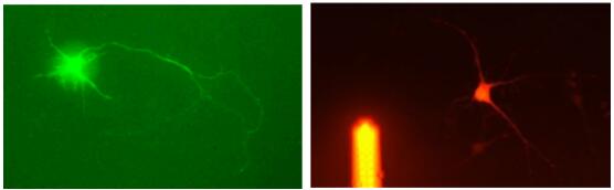 右圖:注射后紅色熒光葡聚糖在C57BL/6 C57小鼠海馬神經(jīng)元中擴散(北京大學(xué),中國北京)
