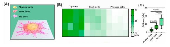 來自北京大學(xué)口腔醫(yī)院的研究團隊采用了多功能單細(xì)胞顯微操作系統(tǒng)——FluidFM技術(shù),完成了單個細(xì)胞的分離,單個細(xì)胞粘附力的測量。在這項研究中,作者研究了基質(zhì)硬度對尖端細(xì)胞形成的影響,并探索了基礎(chǔ)機制。在肝癌細(xì)胞的外層發(fā)現(xiàn)CD31表達(dá)更高,組織硬度也更高;|(zhì)的硬度增加可以顯著增加血管的生成和尖端細(xì)胞富集基因的表達(dá)。硬度較大的基質(zhì)增加了FAK和p-PXN的局灶黏附,提高了活性Rac1的水平,進(jìn)而導(dǎo)致細(xì)胞骨架組織和細(xì)胞剛度增加。隨后,YAP作為下游的力效應(yīng)因子被激活并易位入核,上調(diào)靶基因的表達(dá),最終促進(jìn)尖端細(xì)胞的形成。p-PXN還可以減少細(xì)胞間的連接,從而促進(jìn)尖端細(xì)胞的形成。由此得出結(jié)論:基質(zhì)硬度可通過p-PXN-Rac1-YAP信號軸調(diào)節(jié)尖端細(xì)胞的形成。