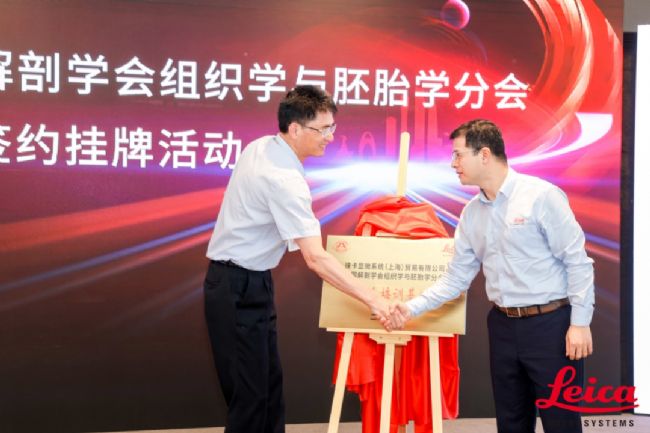 中國解剖學(xué)會副理事長、組胚分會主任委員周德山教授與徠卡顯微系統(tǒng)生命科學(xué)銷售總監(jiān)吳長發(fā)先生進(jìn)行了徠卡顯微系統(tǒng)與中國解剖學(xué)會組織學(xué)與胚胎學(xué)分會正式戰(zhàn)略簽約!中國解剖學(xué)會副理事長李和教授 ,徠卡顯微系統(tǒng)生命科學(xué)市場部經(jīng)理方策先生共同揭牌!賦能學(xué)科建設(shè),點(diǎn)燃發(fā)展引擎,徠卡將持續(xù)為科學(xué)研究和教學(xué)過程帶來有力的技術(shù)支撐。