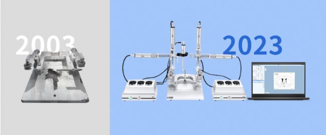 瑞沃德從成立之初就一直致力于動物腦立體定位儀的研發(fā),并于2003年推出標(biāo)準(zhǔn)型腦立體定位儀,但由于技術(shù)限制,精度僅達(dá)到100 μm,位移距離只能依靠人工讀數(shù)。2004年,數(shù)顯型定位儀在不斷測試中誕生,操作臂安裝高精度磁柵傳感器,位移距離可在數(shù)顯屏幕上,精度提升至10 μm。技術(shù)方面,為了改善用戶體驗,瑞沃德研發(fā)團(tuán)隊將傳統(tǒng)三頭絲桿換成雙頭絲桿,可夾持較重的配件。同時更換操作臂材質(zhì)、改變螺紋,進(jìn)一步提升其精度及耐磨性。