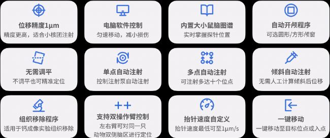而隨著神經(jīng)科學(xué)的不斷發(fā)展,實驗方式愈加復(fù)雜,為了進(jìn)一步簡化用戶實驗步驟,2020年可節(jié)省大量調(diào)平時間的旋轉(zhuǎn)型數(shù)顯腦立體定位儀上市。緊接著瑞沃德又在2023年推出新款全自動腦立體定位儀,其位移精度達(dá)1 μm,精準(zhǔn)定位小核團(tuán);軟件內(nèi)置腦圖譜,即可實時觀察探針位置,使腦立體定位手術(shù)更直觀;又有腦圖校準(zhǔn)功能,無需調(diào)平也能精準(zhǔn)定位,自動化程序(自動開顱、組織移除及自動注射程序)大大減少人為操作誤差。