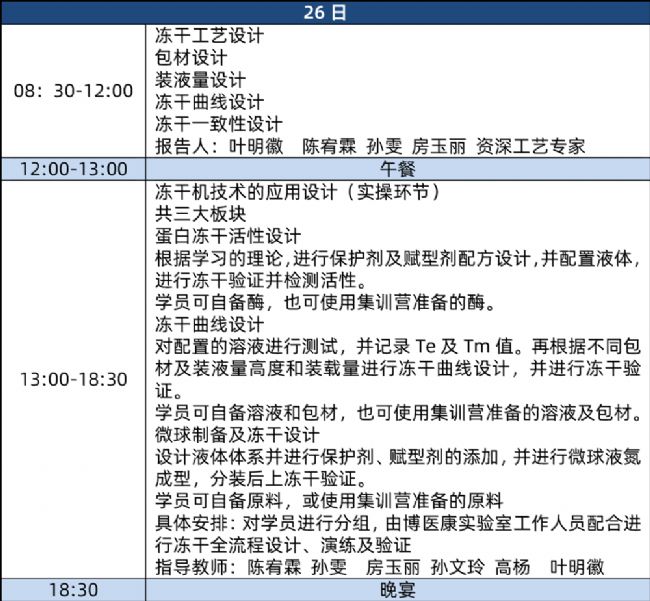 凍干應(yīng)用技術(shù)詳解,包括凍干機(jī)理、凍干組分設(shè)計(jì)、凍干工藝設(shè)計(jì)、凍干產(chǎn)線設(shè)計(jì)及凍干技術(shù)在各應(yīng)用領(lǐng)域應(yīng)用案例。同時(shí)有豐富的設(shè)計(jì)實(shí)操環(huán)節(jié),可以與博醫(yī)康凍干實(shí)驗(yàn)室老師深入交流凍干設(shè)計(jì)生產(chǎn)的細(xì)節(jié)以及凍干機(jī)的使用和凍干過程中遇到的問題。凍干工藝設(shè)計(jì)技術(shù)進(jìn)階是本次集訓(xùn)營(yíng)核心內(nèi)容。培訓(xùn)考核合格人員,發(fā)放培訓(xùn)證書。