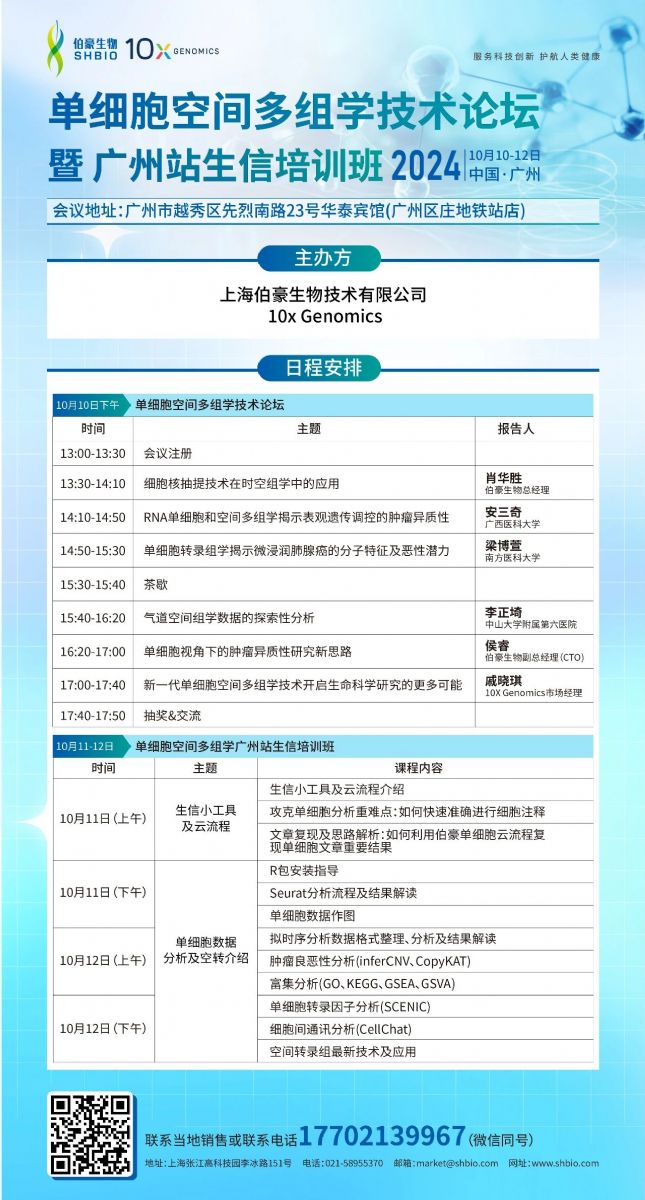 隨著生命科學的飛速發(fā)展,單細胞空間多組學技術已成為研究細胞功能、疾病機制及生物過程的重要工具。這一技術不僅極大地提高了我們對復雜生物系統(tǒng)的理解,還為疾病的精準診斷和治療開辟了新的道路。然而,技術的快速發(fā)展也帶來了數(shù)據(jù)分析和解讀的挑戰(zhàn)。為了促進學術交流,提升科研人員在生信分析實操中的技能,伯豪生物聯(lián)合10x Genomics特此舉辦“單細胞空間多組學技術論壇暨廣州站生信培訓班”。