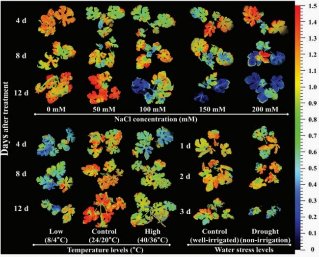 應(yīng)用案例:全北國立大學(xué)的研究人員使用FluorCam系統(tǒng)研究了鹽度、溫度和干旱等不同非生物脅迫條件下不同嫁接方式的西瓜幼苗的生長潛力。實(shí)驗(yàn)結(jié)果表明:鹽脅迫中大多數(shù)葉綠素?zé)晒鈪?shù)只在較高的鹽度脅迫(>50 mm)下受到影響,其中影響最大的參數(shù)是Fv/Fm、NPQ、Rfd和Y(NO);與高溫脅迫相比,低溫對幾乎所有的葉綠素?zé)晒鈪?shù)都有顯著影響,說明低溫對光合作用的光抑制作用比高溫更嚴(yán)重;干旱脅迫對葉綠素?zé)晒鈪?shù)的影響與高溫脅迫相似,僅在Rfd和NPQ上表現(xiàn)出顯著變化。(Shin Y K, Bhandari S R, Lee J G.Monitoring of Salinity, Temperature, and Drought Stress in Grafted Watermelon Seedlings Using ChlorophyllFluorescence[J].Frontiers in Plant Science, 2021.)