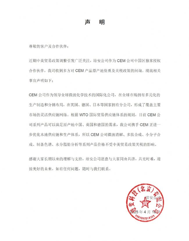 近期中美貿(mào)易政策調(diào)整引發(fā)廣泛關(guān)注,培安公司作為CEM公司中國(guó)區(qū)獨(dú)家授權(quán)合作伙伴,我司收到多方對(duì)CEM產(chǎn)品原產(chǎn)地資質(zhì)及關(guān)稅政策的問詢。現(xiàn)就相關(guān)事宜聲明如下: