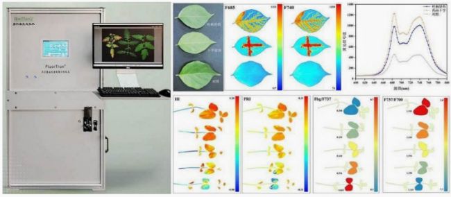 FluorTron®多功能高光譜成像分析系統(tǒng):可同時對反射光和生物自發(fā)熒光(包括葉綠素熒光和次生代謝物熒光)進行高光譜成像分析;右上:葉片DCMU處理實驗的葉綠素熒光成像及熒光光譜圖;右下:不同濃度除草劑處理水培大豆苗的反射光譜植被指數(shù)、次生代謝物與葉綠素熒光成像圖