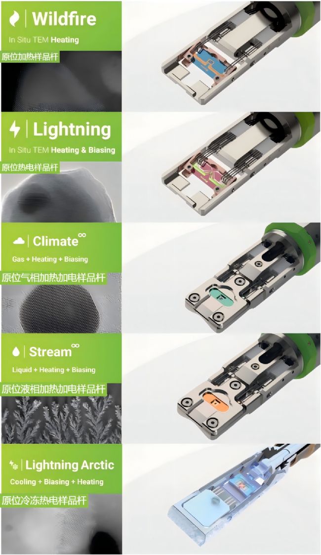 DENSsolutions 產(chǎn)品可以為原位 TEM 樣品施加外界刺激,捕捉 TEM 樣品在真實(shí)環(huán)境下的動態(tài)現(xiàn)象。目前提供的四種原位實(shí)驗(yàn)方案:Wildfire TEM 原位加熱方案、Lightning TEM 原位熱電方案、Arctic TEM 原位低溫冷凍熱電方案、Climate Infinity TEM 原位氣相加熱加電方案和 Stream Infinity TEM 原位液相加熱加電方案,為各學(xué)科領(lǐng)域在相關(guān)條件下研究各種材料和工藝開辟了前所未有的可能性。