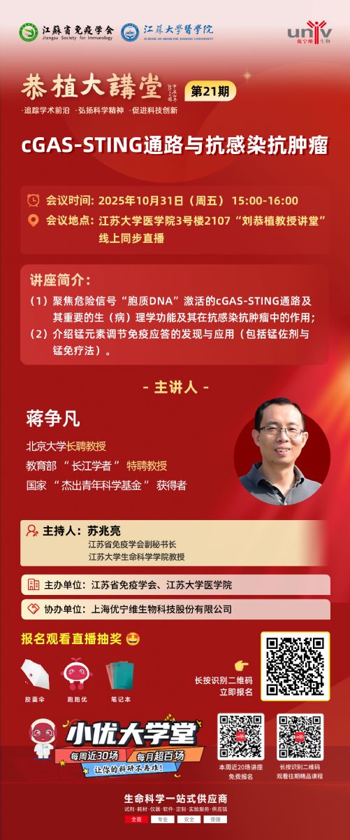 第 21 期(15:00-16:00):蔣爭(zhēng)凡教授《cGAS-STING 通路與抗感染抗腫瘤》