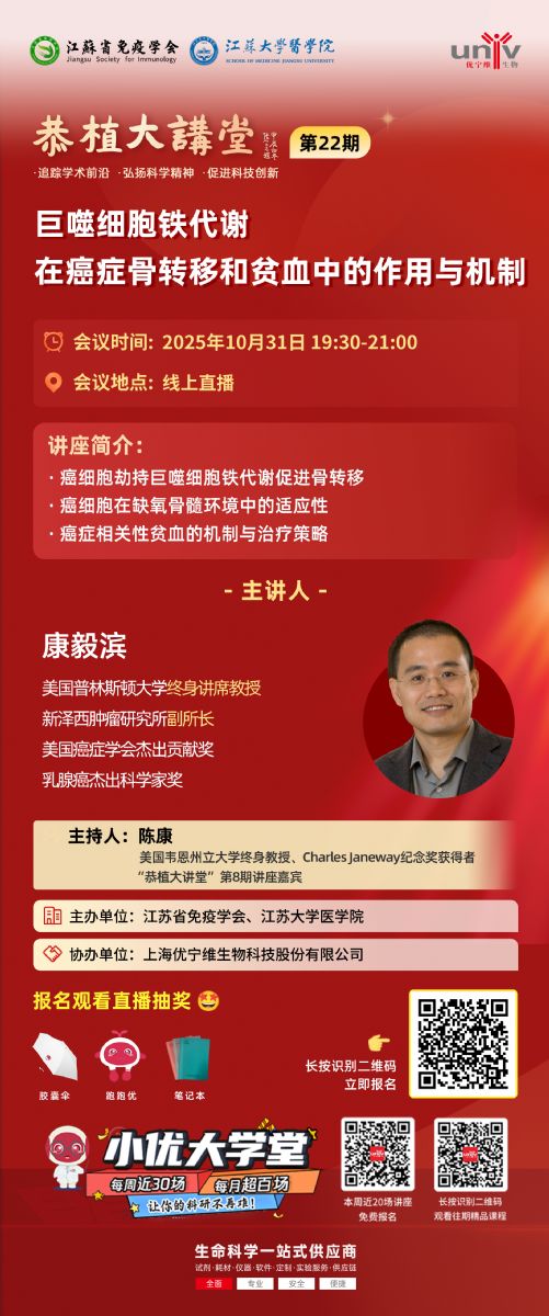 作為為緬懷江蘇省免疫學(xué)會(huì)奠基人劉恭植教授、傳承 “謙恭仁厚恩植學(xué)子,甘為人梯慧潤(rùn)后輩” 精神的重磅學(xué)術(shù) IP,「恭植大講堂」由江蘇省免疫學(xué)會(huì)、江蘇大學(xué)醫(yī)學(xué)院聯(lián)合上海優(yōu)寧維生物科技股份有限公司重磅打造,至今已舉辦 20 期精品課堂,吸引超萬(wàn)名科研學(xué)者、臨床專(zhuān)家、研究生參與,每一期都是 “干貨滿溢、觀點(diǎn)碰撞” 的學(xué)術(shù)盛宴。
