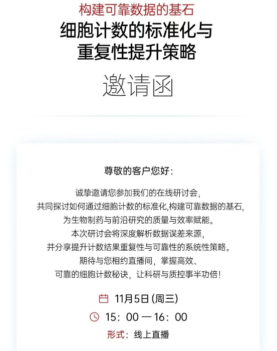 本次直播將帶您從“誤差來(lái)源”出發(fā),深入剖析計(jì)數(shù)標(biāo)準(zhǔn)化的核心技術(shù)路徑,并結(jié)合實(shí)際案例解析自動(dòng)化細(xì)胞計(jì)數(shù)如何助力科研與生產(chǎn)數(shù)據(jù)更精準(zhǔn)、更合規(guī)、更高效。