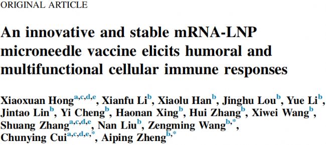 Xiaoxuan Hong, Xianfu Li, Xiaolu Han, Jinghu Lou, Yue Li, Jintao Lin, Yi Cheng, Haonan Xing, Hui Zhang, Xiwei Wang, Shuang Zhang, Nan Liu, Zengming Wang, Chunying Cui, Aiping Zheng, An innovative and stable mRNA-LNP microneedle vaccine elicits humoral and multifunctional cellular immune responses, Acta Pharmaceutica Sinica B, https://doi.org/10.1016/j.apsb.2025.10.006.