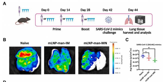 該研究開發(fā)了一種新型的mRNA-LNP微針疫苗遞送系統(tǒng),具有良好的穩(wěn)定性和有效性,能夠誘導(dǎo)強(qiáng)烈的體液免疫和細(xì)胞免疫反應(yīng),并具有一定的肺部保護(hù)效果。該系統(tǒng)為開發(fā)針對 SARS-CoV-2等傳染性病原體的mRNA疫苗提供了一種新的策略,并有助于提高疫苗在全球范圍內(nèi)的可及性和有效性。