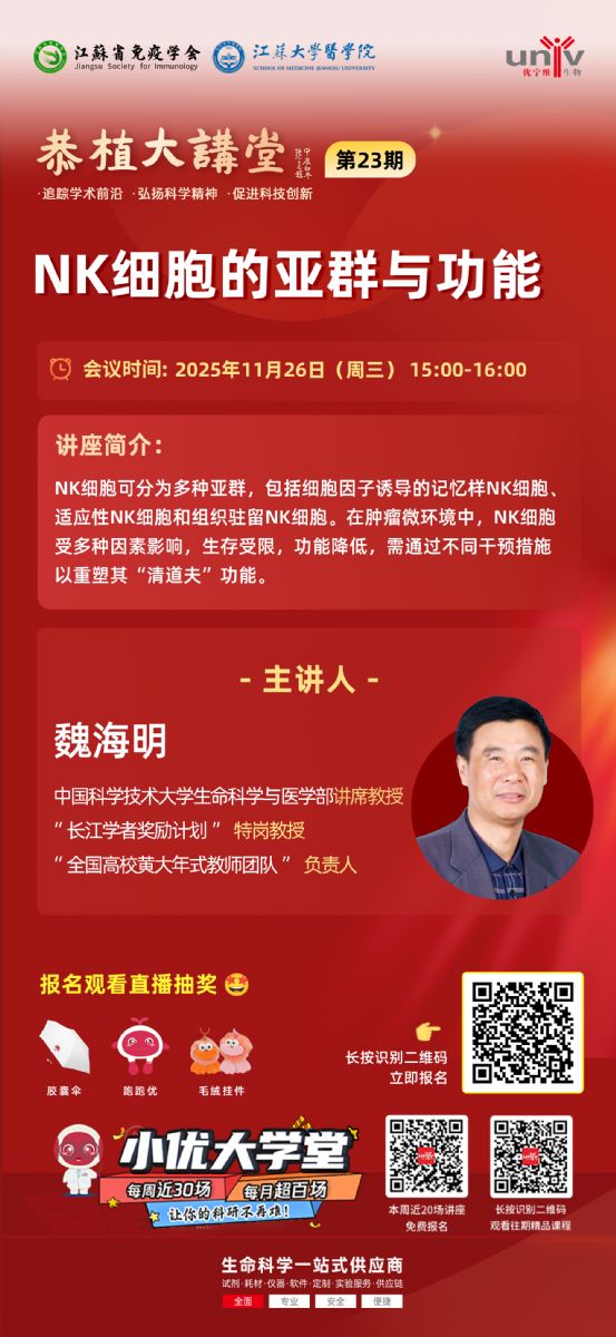 NK 細胞的亞群分類、功能異質(zhì)性,是當前腫瘤免疫、免疫治療研究的核心難點 —— 不同 NK 亞群如何精準鑒定?腫瘤微環(huán)境中 NK 細胞功能衰減的關(guān)鍵機制是什么?如何靶向重塑其效應(yīng)功能?這些直接影響研究推進的問題,這場權(quán)威講座將給出一線解析。