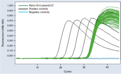 MagNA Pure 96系統(tǒng)能在每次分離反應(yīng)中都包括一次內(nèi)部質(zhì)控(IC)。 IC從機(jī)載IC管中自動移入每個(gè)孔中的溶解緩沖液中。在一次純化操作的所有96個(gè)孔中,采用稀釋的細(xì)小病毒B19質(zhì)粒作為IC,陰性血清作為樣品材料來檢查該功能。 IC的分離具有很高的可重復(fù)性(圖5)。