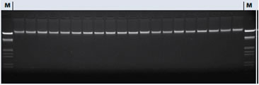 圖2: 對血液中分離的DNA的瓊脂糖凝膠(顯示20個復(fù)本)。 在21 kb位置的DNA帶顯示了分離DNA的高完整度。 (M=分子量標(biāo)記III)