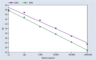 圖4: 線性范圍。 每份樣品中加樣濃度為10-106拷貝的Epstein-Barr病毒(EBV)DNA和甲型肝炎病毒RNA的分離。
