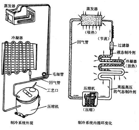 通過壓縮機(jī)將制冷劑(R134a)打壓成高壓的氣體,然后通過冷凝器變成高壓液體(制冷劑液化放熱,所以制冷時外機(jī)兩側(cè)是熱的),通過毛細(xì)管變成低壓低溫液體.然后通過蒸發(fā)器變成低壓氣體,因制冷劑氣化吸熱.所以制冷時內(nèi)部是涼的,然后制冷劑再次回到壓縮機(jī)重復(fù)上述工作。