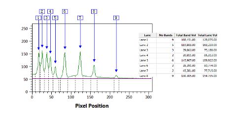 1.在樣品上進(jìn)行泳道劃分 2.設(shè)置閾值,檢測條帶
