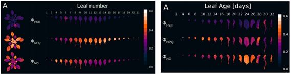 Bielczynski為了研究擬南芥葉片和植株年齡對(duì)光合能力的影響,使用FytoScope生長(zhǎng)箱模擬了長(zhǎng)期高光適應(yīng)培養(yǎng)過(guò)程,最高光強(qiáng)1800µmol(photons)/m².s。同時(shí)使用FluorCam葉綠素?zé)晒獬上裣到y(tǒng)進(jìn)行不同生長(zhǎng)階段擬南芥植物與葉片的葉綠素?zé)晒獬上駵y(cè)量(圖10),從而發(fā)現(xiàn)在擬南芥生長(zhǎng)過(guò)程中,穩(wěn)態(tài)的光合能力在逐漸上升。在高光脅迫下,老葉的適應(yīng)能力要低于幼葉。