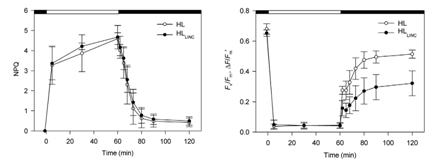 Domingues研究了硅藻Phaeodactylumtricornutum對(duì)高光照造成的光氧化脅迫的響應(yīng)機(jī)制(Domingues,2012)。發(fā)現(xiàn)將低光適應(yīng)(40µmol(photons)/m².s)后的硅藻進(jìn)行高光(1250µmol(photons)/m².s)照射,會(huì)產(chǎn)生非光化學(xué)淬滅(NPQ)的快速響應(yīng)(圖18)。而且高光照對(duì)最大量子產(chǎn)額(Fv/Fm)造成了和林可霉素相同的效果,即活性PSII反應(yīng)中心的顯著減少。